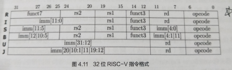 RISC-V采用32位定长指令字格式,如下图所示,共有6种指令格式