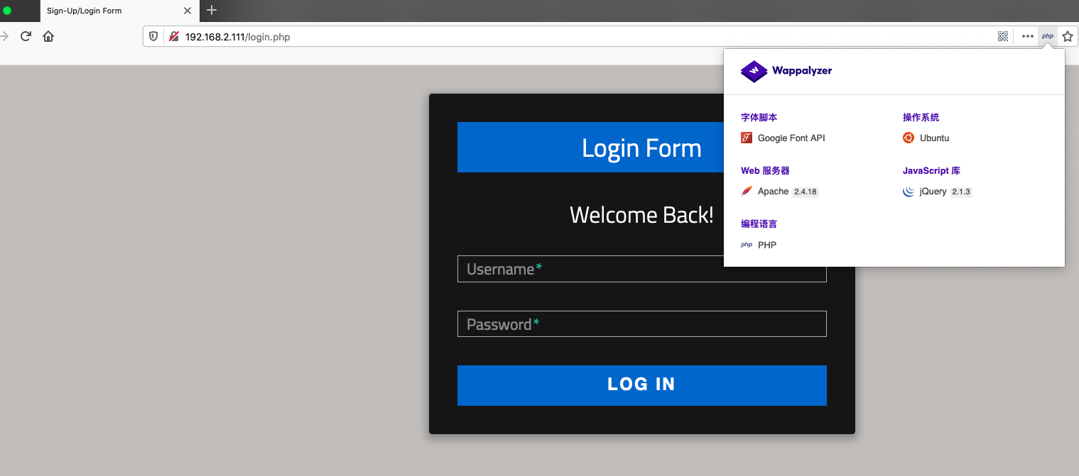 访问http://192.168.2.111,是一个登录界面,,这里wappalyzer自动识别出了网站的指纹信息,如下图所示