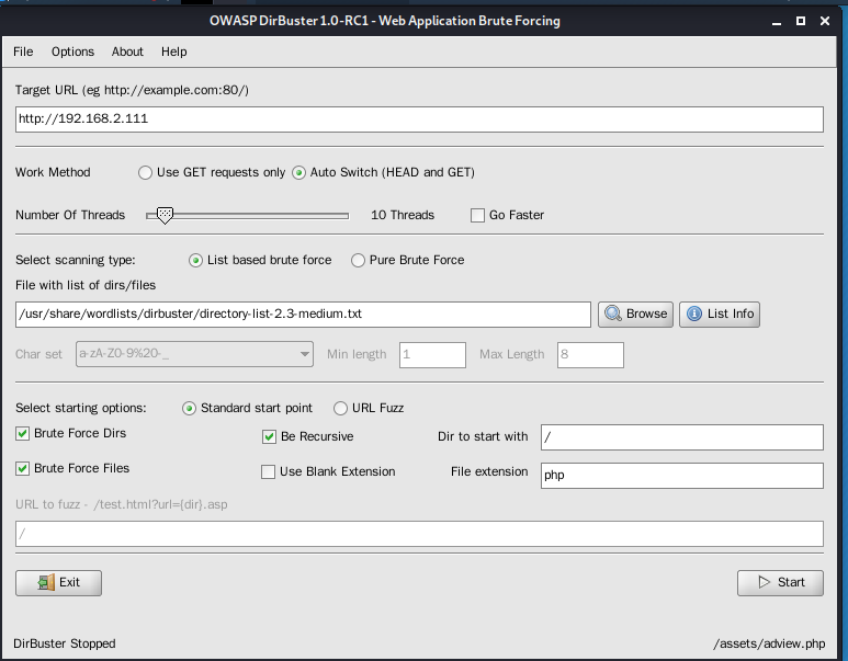 这里使用kali自带的Dirbuster,win下推荐御剑扫描(关键看字典)