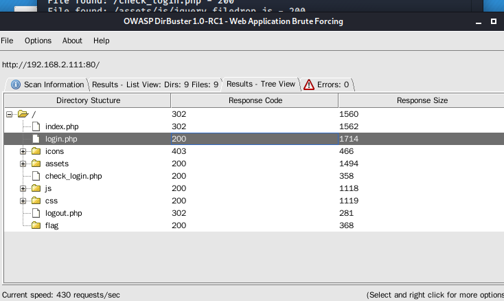 登陆成功,进入一个上传文件的界面,验证一下路径,传正常图不行竟然,但是传php可以,路径在http://192.168.2.111/uploaded_files/下,上传一句话木马,post参数可以使phpinfo()生效,尝试菜刀连接,成功getshell,在/var/www/html目录下发现flag.txt,但是没有权限查看,发现hint.txt,得到第三个flag和提示