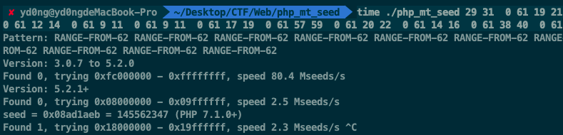 1 | time ./php_mt_seed 29 31 0 61 19 21 0 61 12 14 0 61 9 11 0 61 9 11 0 61 17 19 0 61 57 59 0 61 20 22 0 61 14 16 0 61 38 40 0 61 |