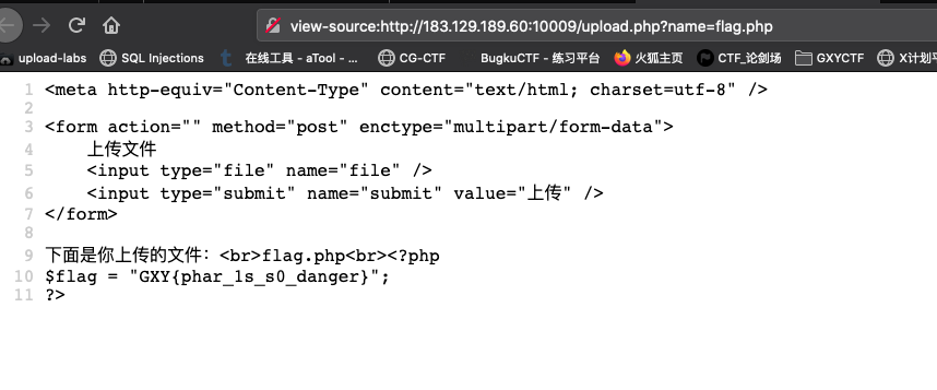 观察到存在GET参数?file=upload,文件包含明细标志,尝试读取源代码